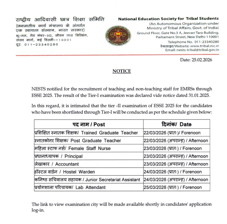 The EMRS Teaching & Non-Teaching Tier-II Exam Date 2026 notice has been officially released for candidates who appeared in the EMRS ESSE Recruitment Examination. Candidates who qualified in Tier-I examination can now check the official notice regarding the Tier-II exam schedule.