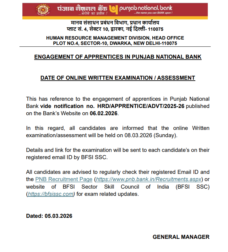 Candidates should carefully check the PNB Bank Apprentice Exam Date 2026 and prepare accordingly.